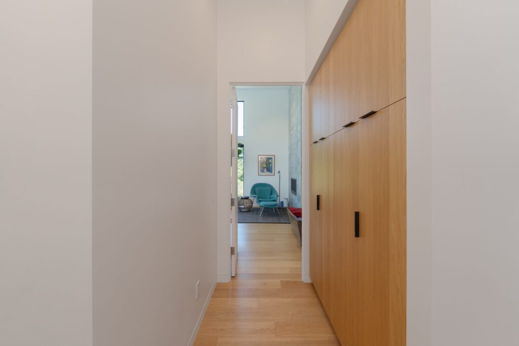 The home has soaring ceilings as high as 16 feet, with steel beams supporting walls of tall windows, showcasing views of wildflower gardens framed by distant mountains. Everything was meticulously designed and thoughtfully executed. The floors are engineered white oak throughout. The living room has a contemporary propane fireplace set in a striking powder coated steel facade. The kitchen was designed by people who love to cook.